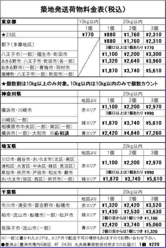 受付締切時間・配送エリア別料金表 Toggle 受付時間築地受付締切時間豊洲受付締切時間築地発送荷物料金表豊洲発送荷物料金表八王子エリアの配送地域と料金表神奈川県エリアの配送地域と料金表千葉県エリアの配送地域と料金表埼玉県エリアの配送地域と料金表 受付時間 築地受付締切時間 豊洲受付締切時間 築地発送荷物料金表 豊洲発送荷物料金表 八王子エリアの配送地域と料金表 神奈川県エリアの配送地域と料金表 千葉県エリアの配送地域と料金表 埼玉県エリアの配送地域と料金表